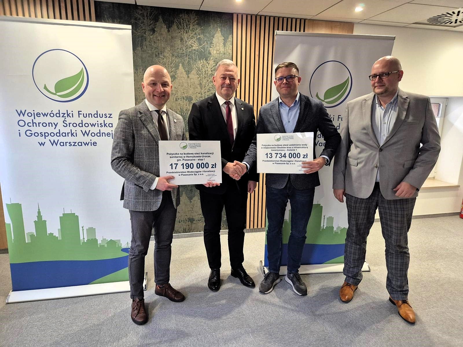 W dniu 24.02.2026r. Przedsiębiorstwo Wodociągów i Kanalizacji w Piasecznie Sp. z o.o. podpisało umowę z Wojewódzki Fundusz Ochrony Środowiska i Gospodarki Wodnej w Warszawie na dofinansowanie w formie pożyczki przedsięwzięcia pn. „Modernizacja Stacji Uzdatniania Wody w Głoskowie”.