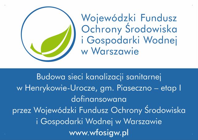 W dniu 24.02.2026 r. Przedsiębiorstwo Wodociągów i Kanalizacji w Piasecznie Sp. z o.o. podpisało umowę z Wojewódzki Fundusz Ochrony Środowiska i Gospodarki Wodnej w Warszawie na dofinansowanie w formie pożyczki przedsięwzięcia pn „Budowa sieci kanalizacji sanitarnej w Henrykowie-Urocze, gm. Piaseczno – etap I”. Inwestycja będzie dofinansowana przez Wojewódzki Fundusz Ochrony Środowiska i Gospodarki Wodnej w Warszawie, w formie pożyczki w kwocie 17.190.000,00 zł.